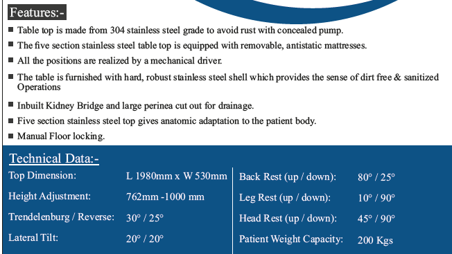 A single action double cylinder hydraulic pump controlled by a foot pedal. Five section translucent top with large perenial cut out for drainage tray. Stainless steel base with Auto Locking System. Concealed Gear Mechanism. Rubberized mattress thickness 50mm.