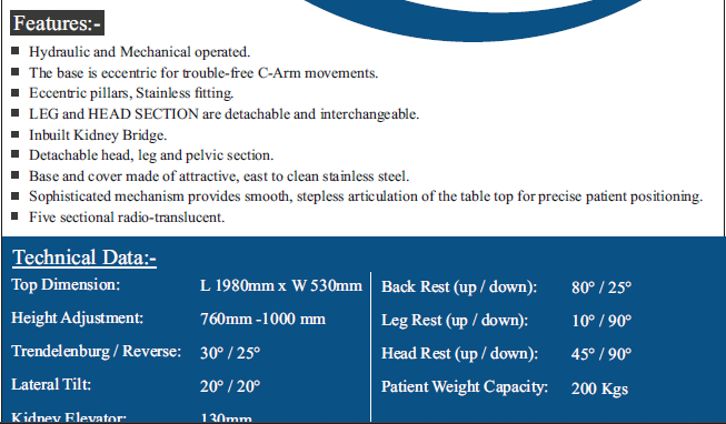 C Arm Compatible Hydraulic OT Table provided, is adjusted using a heavy-duty, leak-proof hydraulic pump hidden inside a stainless steel-covered chamber. The Table's stable stainless steel design relieves stress for surgeons during surgical procedures.